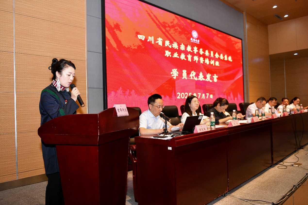 接着,吉布阿佳代表全体学员作了发言。她向四川省民族宗教委的关怀、成都大学的精心组织表示感谢。并承诺以空杯心态投入学习,推动培训成果转化,严格遵守培训纪律,服从管理安排,认真学习,满载而归。